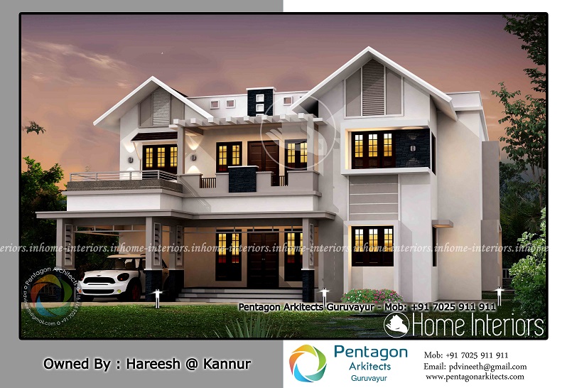 We are good about home designing as which it is the total creative solution for the best programmed interior of our homes. This “2625 Square Feet Double Floor Contemporary Home Design” is designed to be built in an estimation of 53 Lac’s. It includes 4 bedrooms with the combination of attached bathrooms and a common bathroom. This plan is a double floored which makes out a distinctive and unique design. Also it provides the best conceptual planning with aesthetic and technical solutions which are applied to achieve the desired result. The living and dining room are very well designed and the kitchen along with work area are really spacious. This plan is designed in a manner for the latest interior designs. This plan is well executed by Vineeth, Pentagon Arkitects. For further details contact the designer.